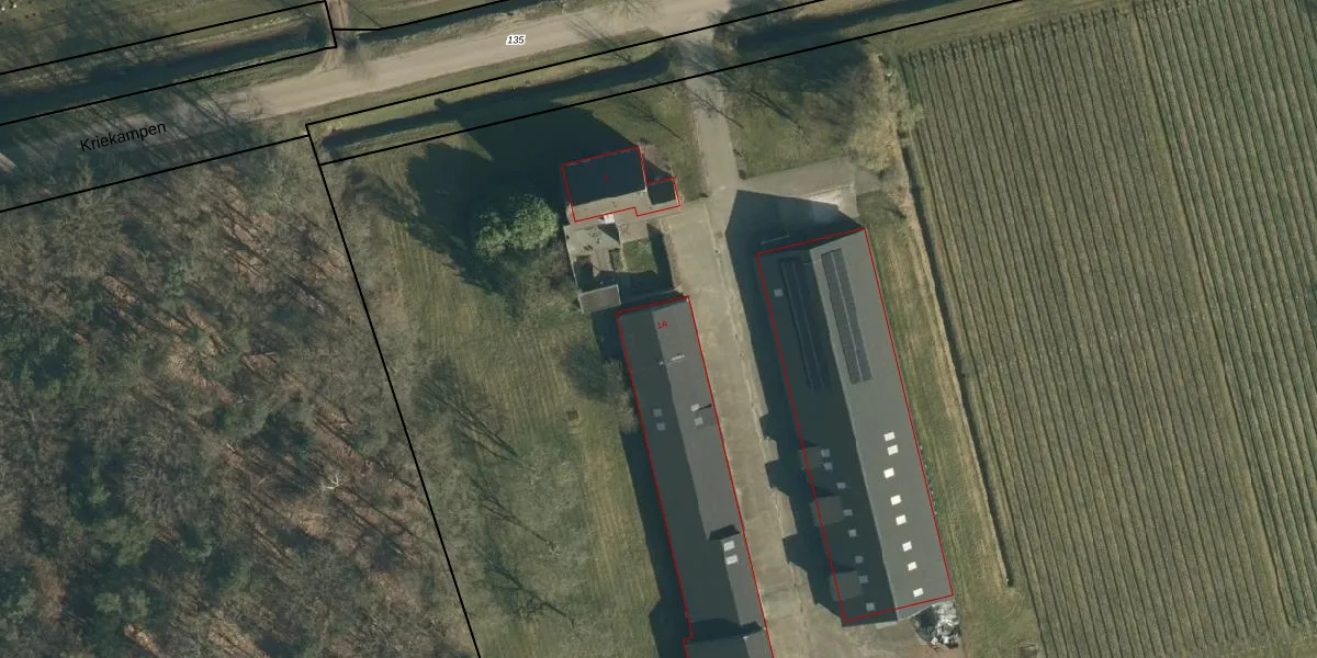Het perceel waarop Kriekampen 1-A staat heeft een oppervlakte van 3,7 ha. Dit is een zeer groot perceel. De perceeloppervlakte wordt geregistreerd door het Kadaster. Gedetailleerde informatie over de maten van dit perceel kunt u vinden in het rapport Kadastrale kaart met maatvoering van Kriekampen 1-A.