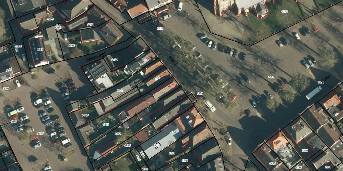 Het perceel waarop Markt 16 staat heeft een oppervlakte van 585 m². Dit is een groot perceel. De perceeloppervlakte wordt geregistreerd door het Kadaster. Gedetailleerde informatie over de maten van dit perceel kunt u vinden in het rapport Kadastrale kaart met maatvoering van Markt 16.