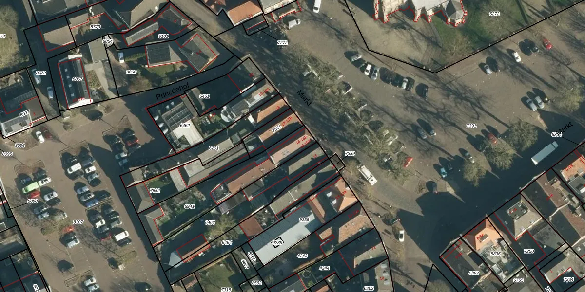 Het perceel waarop Markt 16-A staat heeft een oppervlakte van 585 m². Dit is een groot perceel. De perceeloppervlakte wordt geregistreerd door het Kadaster. Gedetailleerde informatie over de maten van dit perceel kunt u vinden in het rapport Kadastrale kaart met maatvoering van Markt 16-A.
