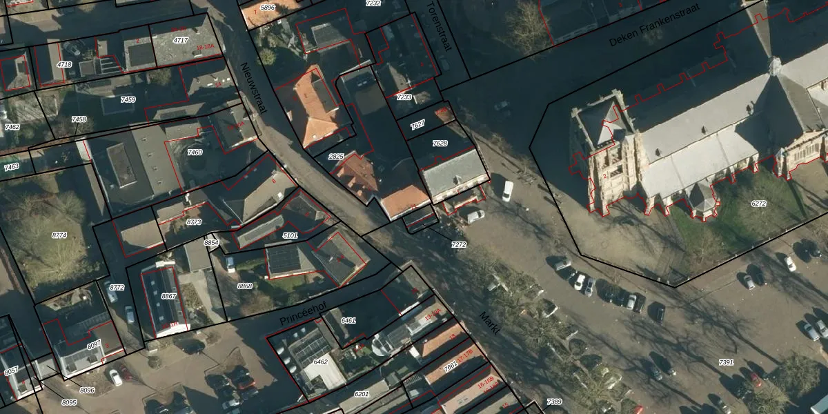 Het perceel waarop Markt 21 staat heeft een oppervlakte van 490 m². Dit is een groot perceel. De perceeloppervlakte wordt geregistreerd door het Kadaster. Gedetailleerde informatie over de maten van dit perceel kunt u vinden in het rapport Kadastrale kaart met maatvoering van Markt 21.