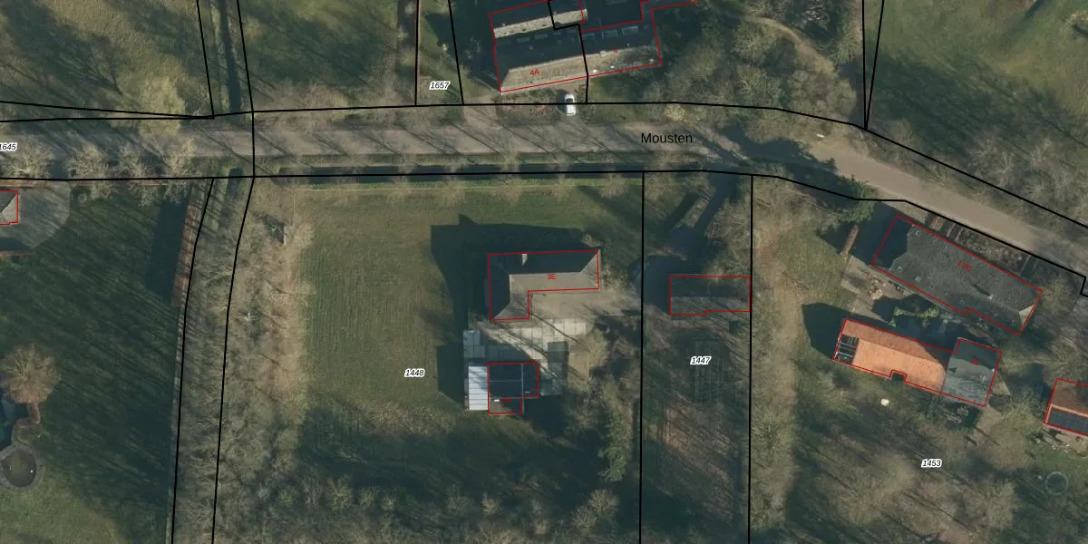 Het perceel waarop Mousten 3-E staat heeft een oppervlakte van 5450 m². Dit is een zeer groot perceel. De perceeloppervlakte wordt geregistreerd door het Kadaster. Gedetailleerde informatie over de maten van dit perceel kunt u vinden in het rapport Kadastrale kaart met maatvoering van Mousten 3-E.