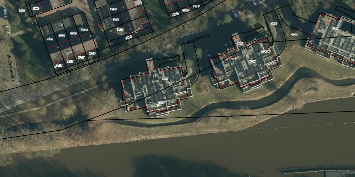 Het perceel waarop Parallelweg 27 staat heeft een oppervlakte van 338 m². Dit is een groot perceel. De perceeloppervlakte wordt geregistreerd door het Kadaster. Gedetailleerde informatie over de maten van dit perceel kunt u vinden in het rapport Kadastrale kaart met maatvoering van Parallelweg 27.