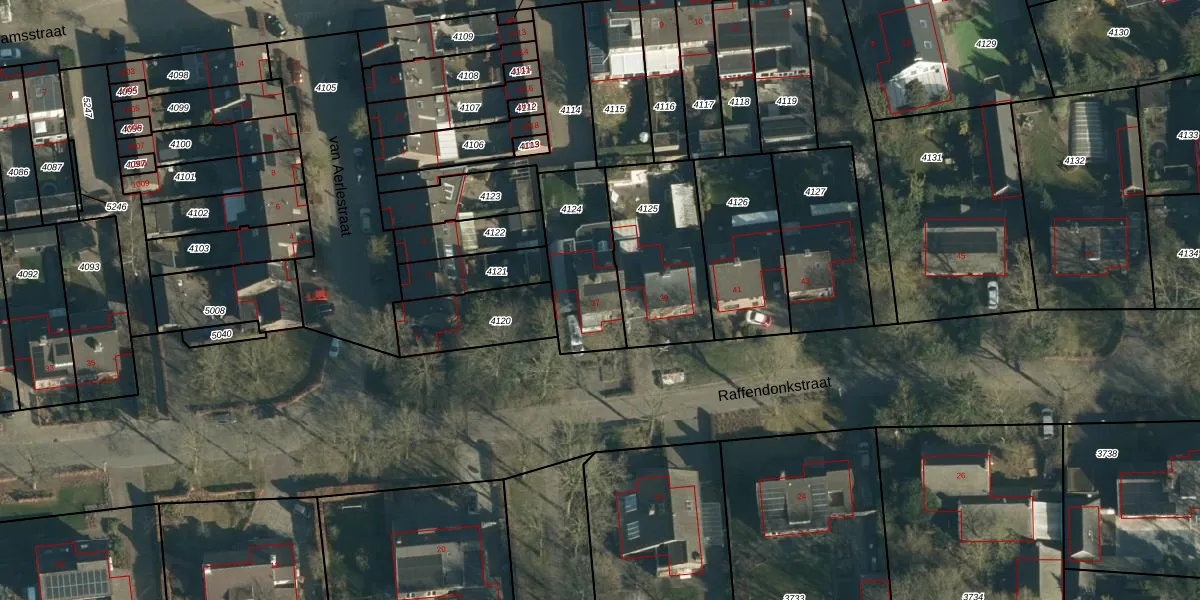 Het perceel waarop Raffendonkstraat 37 staat heeft een oppervlakte van 335 m². Dit is een groot perceel. De perceeloppervlakte wordt geregistreerd door het Kadaster. Gedetailleerde informatie over de maten van dit perceel kunt u vinden in het rapport Kadastrale kaart met maatvoering van Raffendonkstraat 37.