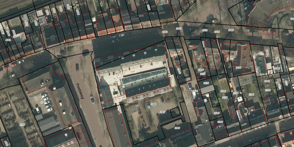Het perceel waarop Poststeeg 5-A staat heeft een oppervlakte van 2632 m². Dit is een zeer groot perceel. De perceeloppervlakte wordt geregistreerd door het Kadaster. Gedetailleerde informatie over de maten van dit perceel kunt u vinden in het rapport Kadastrale kaart met maatvoering van Poststeeg 5-A.
