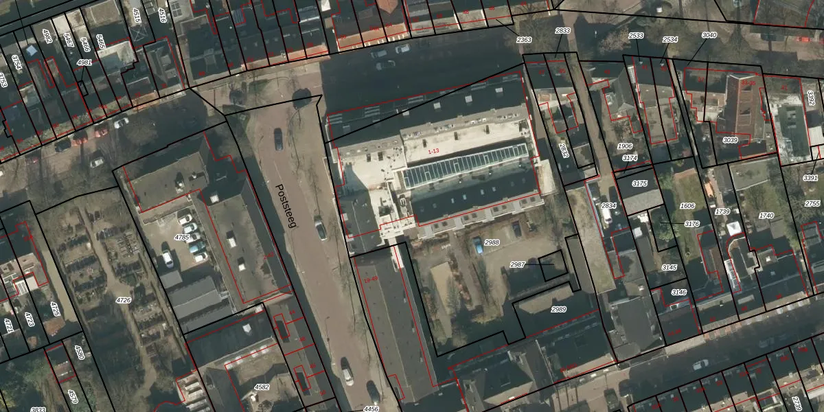 Het perceel waarop Poststeeg 9-A staat heeft een oppervlakte van 2632 m². Dit is een zeer groot perceel. De perceeloppervlakte wordt geregistreerd door het Kadaster. Gedetailleerde informatie over de maten van dit perceel kunt u vinden in het rapport Kadastrale kaart met maatvoering van Poststeeg 9-A.