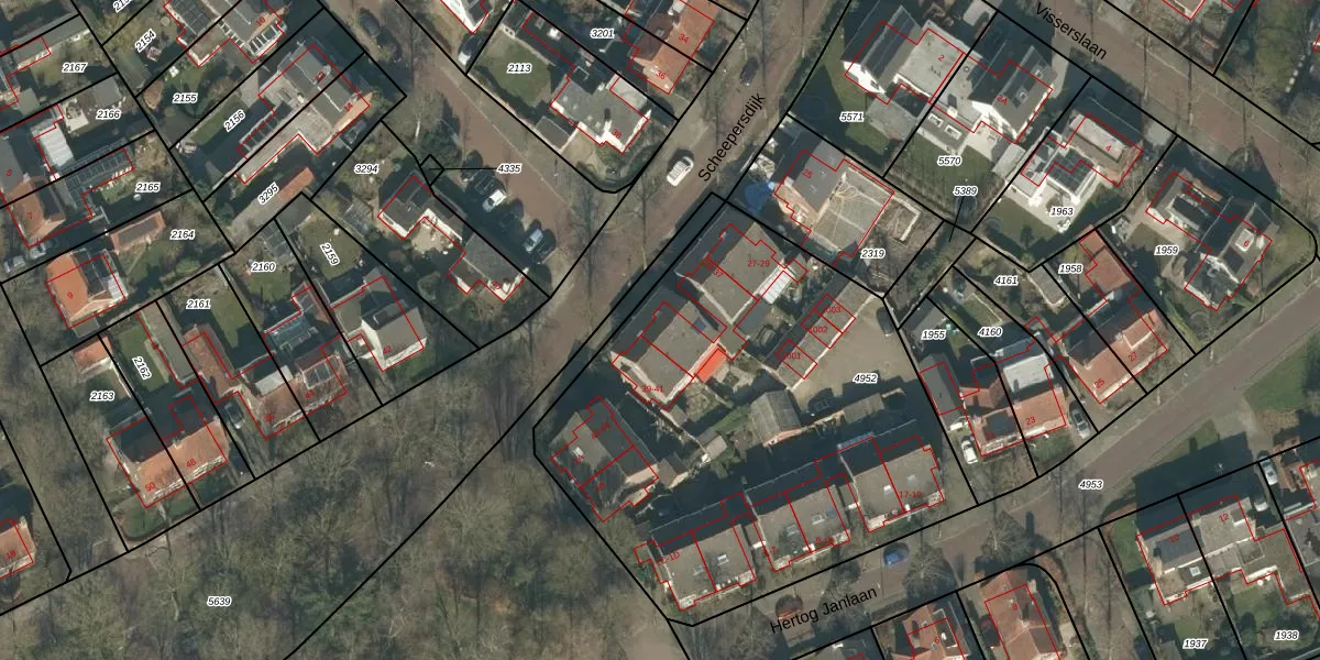 Het perceel waarop Scheepersdijk 37 staat heeft een oppervlakte van 2550 m². Dit is een zeer groot perceel. De perceeloppervlakte wordt geregistreerd door het Kadaster. Gedetailleerde informatie over de maten van dit perceel kunt u vinden in het rapport Kadastrale kaart met maatvoering van Scheepersdijk 37.