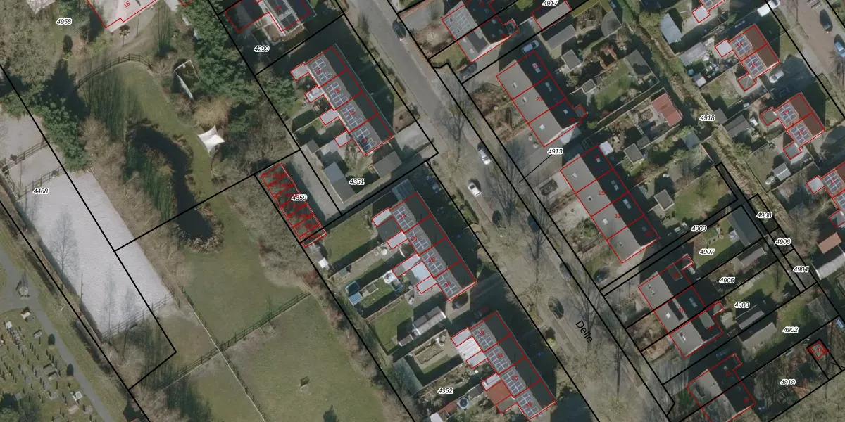 Het perceel waarop Delle 24 staat heeft een oppervlakte van 3302 m². Dit is een zeer groot perceel. De perceeloppervlakte wordt geregistreerd door het Kadaster. Gedetailleerde informatie over de maten van dit perceel kunt u vinden in het rapport Kadastrale kaart met maatvoering van Delle 24.