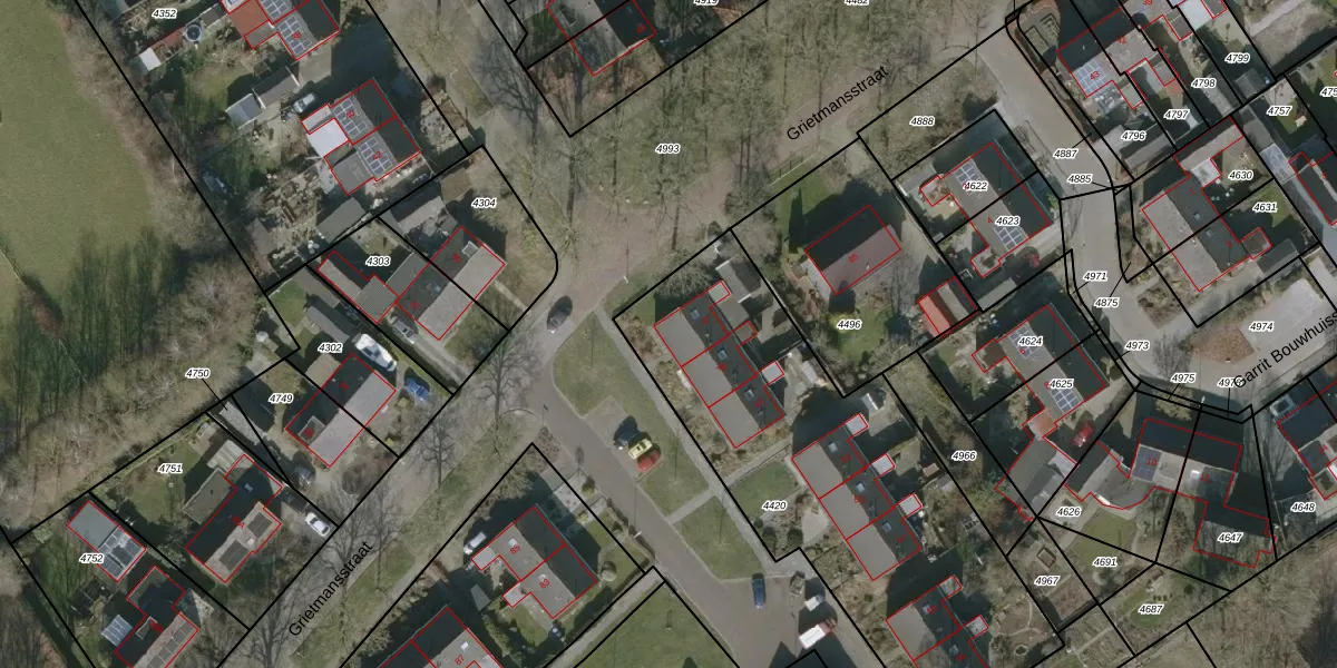 Het perceel waarop Grietmansstraat 47 staat heeft een oppervlakte van 1920 m². Dit is een zeer groot perceel. De perceeloppervlakte wordt geregistreerd door het Kadaster. Gedetailleerde informatie over de maten van dit perceel kunt u vinden in het rapport Kadastrale kaart met maatvoering van Grietmansstraat 47.