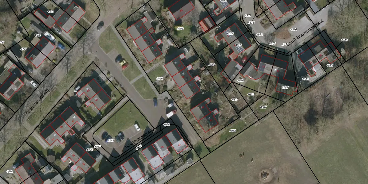 Het perceel waarop Grietmansstraat 57 staat heeft een oppervlakte van 1920 m². Dit is een zeer groot perceel. De perceeloppervlakte wordt geregistreerd door het Kadaster. Gedetailleerde informatie over de maten van dit perceel kunt u vinden in het rapport Kadastrale kaart met maatvoering van Grietmansstraat 57.