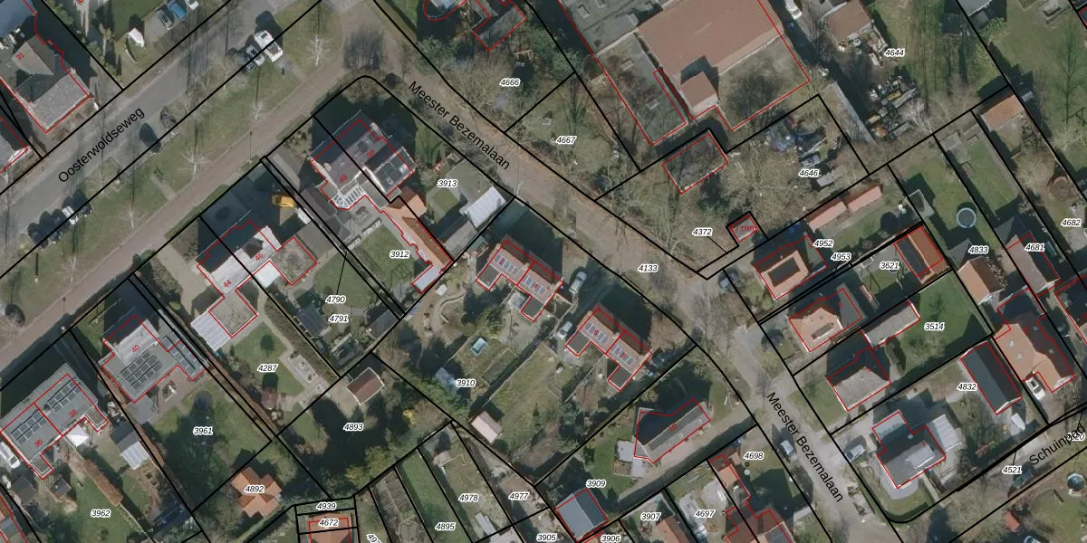 Het perceel waarop Meester Bezemalaan 4 staat heeft een oppervlakte van 1640 m². Dit is een zeer groot perceel. De perceeloppervlakte wordt geregistreerd door het Kadaster. Gedetailleerde informatie over de maten van dit perceel kunt u vinden in het rapport Kadastrale kaart met maatvoering van Meester Bezemalaan 4.
