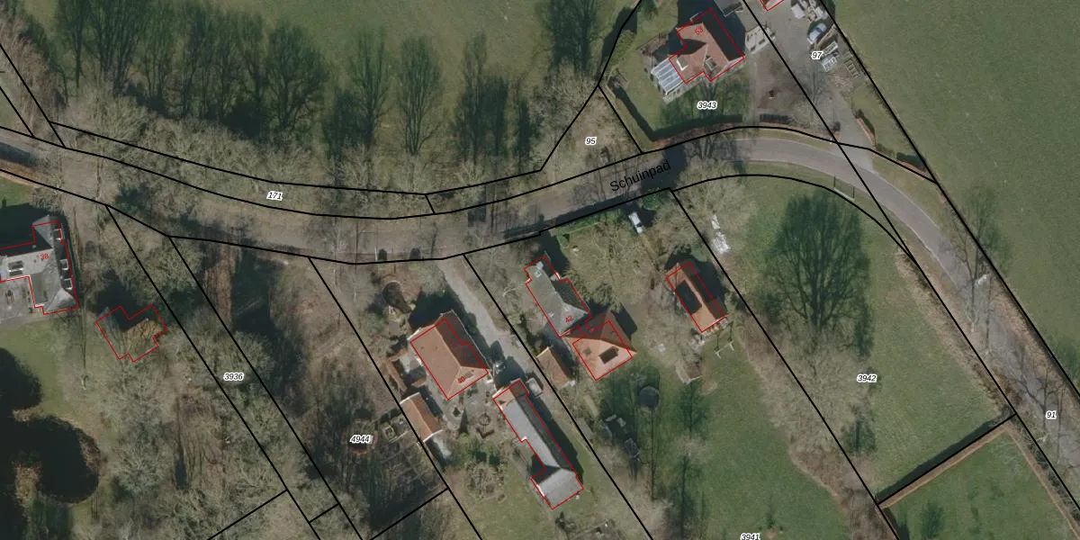 Het perceel waarop Schuinpad 42 staat heeft een oppervlakte van 3210 m². Dit is een zeer groot perceel. De perceeloppervlakte wordt geregistreerd door het Kadaster. Gedetailleerde informatie over de maten van dit perceel kunt u vinden in het rapport Kadastrale kaart met maatvoering van Schuinpad 42.