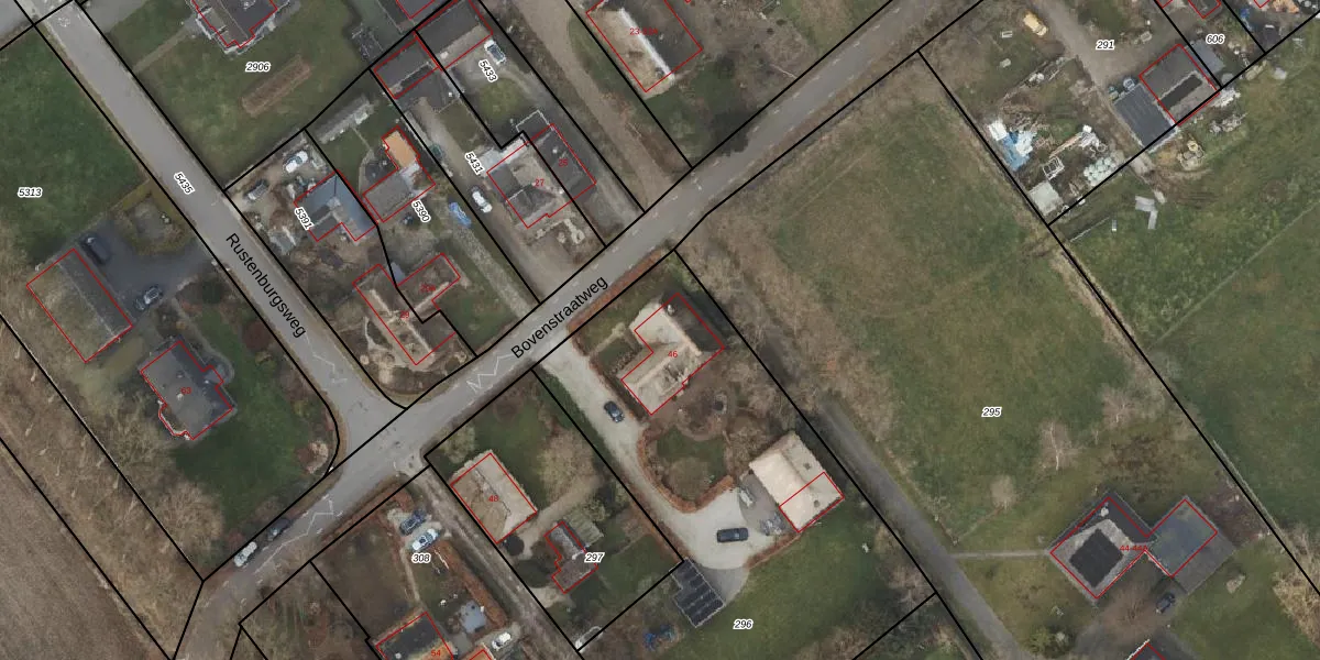 Het perceel waarop Bovenstraatweg 46 staat heeft een oppervlakte van 2390 m². Dit is een zeer groot perceel. De perceeloppervlakte wordt geregistreerd door het Kadaster. Gedetailleerde informatie over de maten van dit perceel kunt u vinden in het rapport Kadastrale kaart met maatvoering van Bovenstraatweg 46.