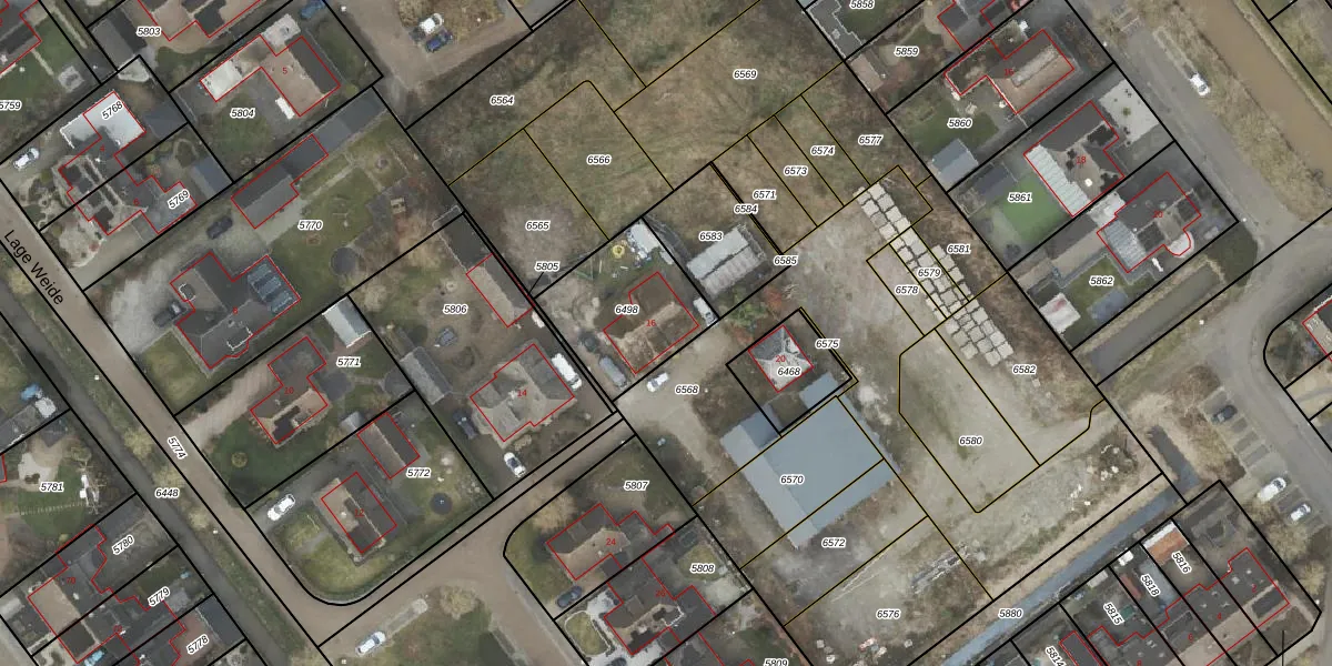 Lage Weide 16 is gelegen op kadastraal perceel ODB01H6498. Deze kadastrale aanduiding is uniek en wordt gebruikt door het Kadaster om eigendomsrechten en andere zakelijke rechten vast te leggen. Het perceel maakt onderdeel uit van de kadastrale gemeente Oldebroek.