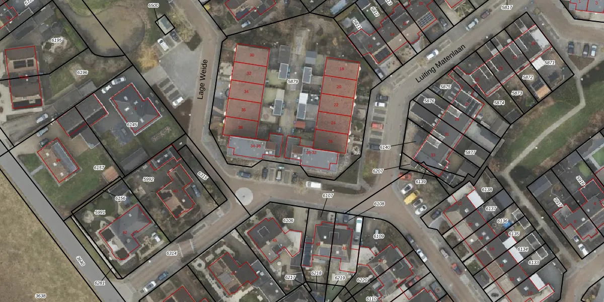 Luiting Matenlaan 32 is gelegen op kadastraal perceel ODB01H5879. Deze kadastrale aanduiding is uniek en wordt gebruikt door het Kadaster om eigendomsrechten en andere zakelijke rechten vast te leggen. Het perceel maakt onderdeel uit van de kadastrale gemeente Oldebroek.