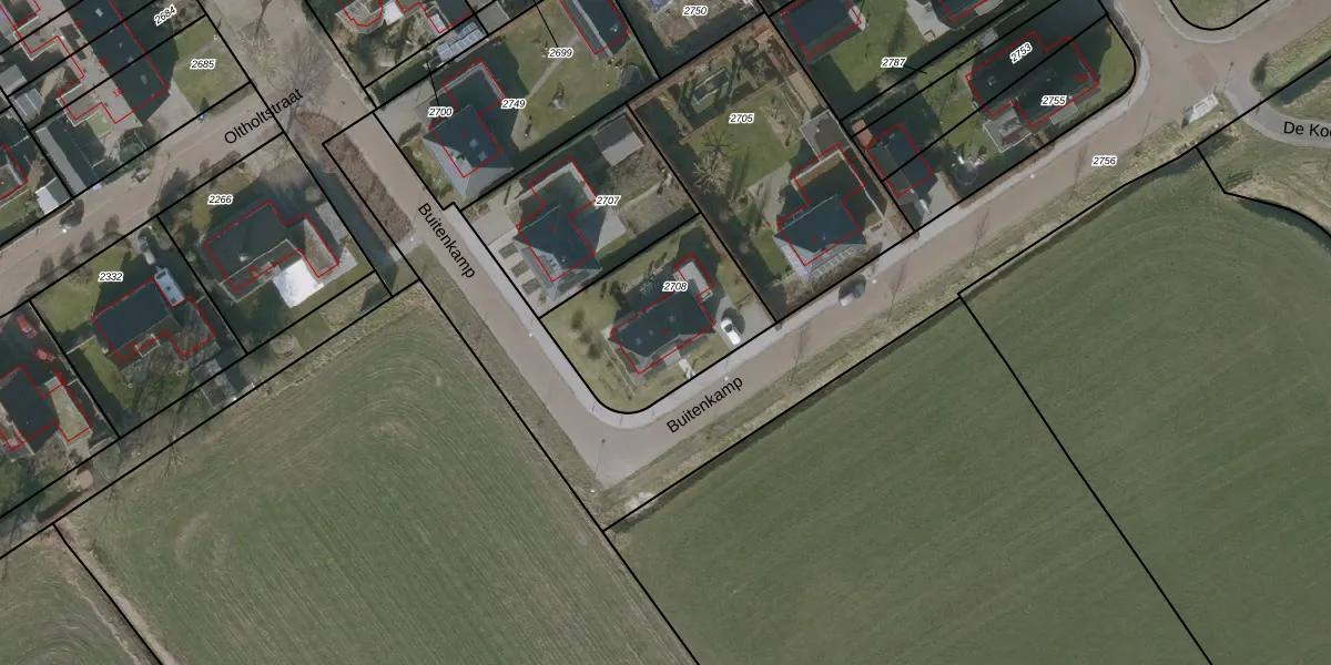 Buitenkamp 5 is gelegen op kadastraal perceel WVG00E2708. Deze kadastrale aanduiding is uniek en wordt gebruikt door het Kadaster om eigendomsrechten en andere zakelijke rechten vast te leggen. Het perceel maakt onderdeel uit van de kadastrale gemeente Wolvega.