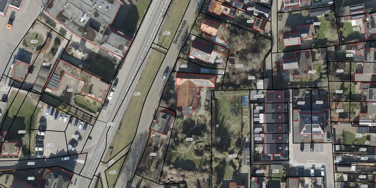Benedendijk 46 is gelegen op kadastraal perceel OLS00B5683. Deze kadastrale aanduiding is uniek en wordt gebruikt door het Kadaster om eigendomsrechten en andere zakelijke rechten vast te leggen. Het perceel maakt onderdeel uit van de kadastrale gemeente Olst.