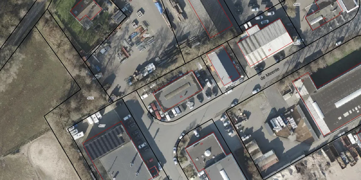 de Meente 21 is gelegen op kadastraal perceel OLS00B4689. Deze kadastrale aanduiding is uniek en wordt gebruikt door het Kadaster om eigendomsrechten en andere zakelijke rechten vast te leggen. Het perceel maakt onderdeel uit van de kadastrale gemeente Olst.