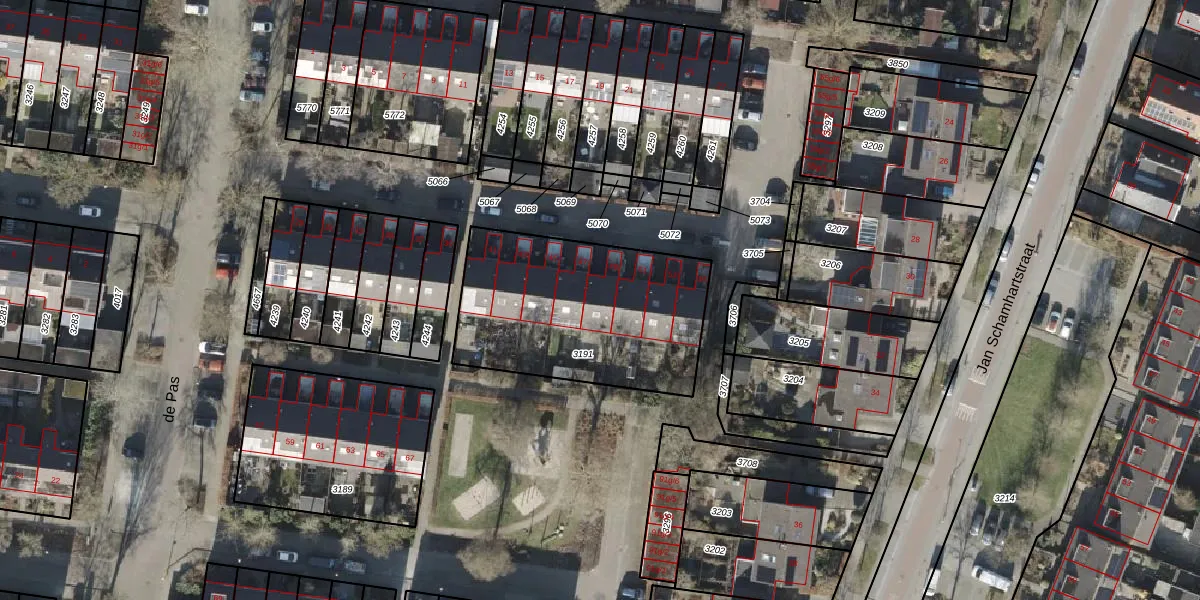 Het perceel waarop de Pas 49 staat heeft een oppervlakte van 935 m². Dit is een groot perceel. De perceeloppervlakte wordt geregistreerd door het Kadaster. Gedetailleerde informatie over de maten van dit perceel kunt u vinden in het rapport Kadastrale kaart met maatvoering van de Pas 49.