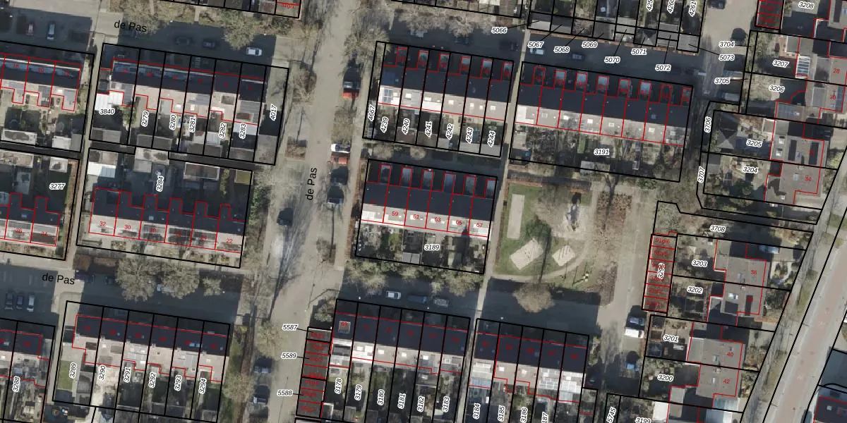 Het perceel waarop de Pas 61 staat heeft een oppervlakte van 703 m². Dit is een groot perceel. De perceeloppervlakte wordt geregistreerd door het Kadaster. Gedetailleerde informatie over de maten van dit perceel kunt u vinden in het rapport Kadastrale kaart met maatvoering van de Pas 61.