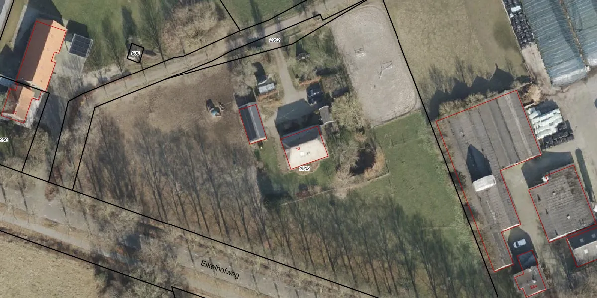 Het perceel waarop Eikelhofweg 33 staat heeft een oppervlakte van 7990 m². Dit is een zeer groot perceel. De perceeloppervlakte wordt geregistreerd door het Kadaster. Gedetailleerde informatie over de maten van dit perceel kunt u vinden in het rapport Kadastrale kaart met maatvoering van Eikelhofweg 33.