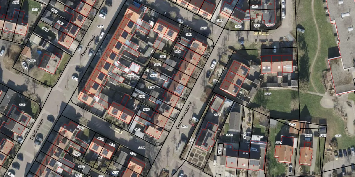 Geraniumstraat 23 is gelegen op kadastraal perceel OLS00E3853. Deze kadastrale aanduiding is uniek en wordt gebruikt door het Kadaster om eigendomsrechten en andere zakelijke rechten vast te leggen. Het perceel maakt onderdeel uit van de kadastrale gemeente Olst.