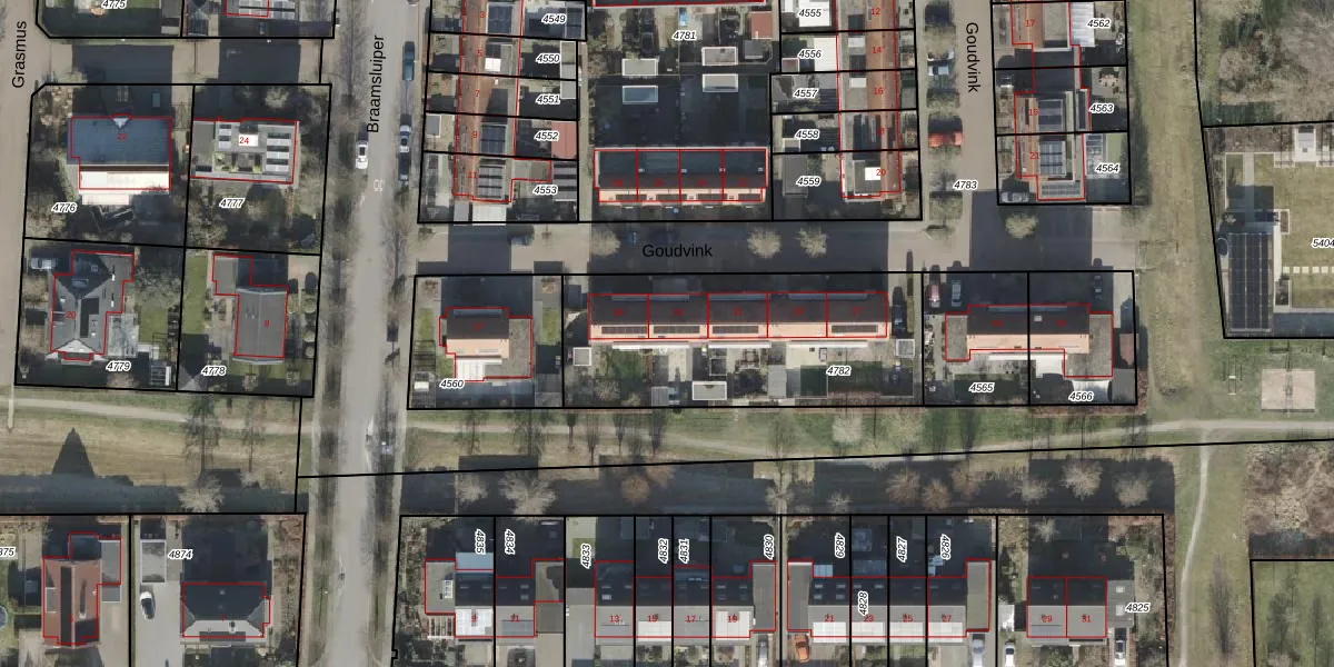 Goudvink 33 is gelegen op kadastraal perceel OLS00F4782. Deze kadastrale aanduiding is uniek en wordt gebruikt door het Kadaster om eigendomsrechten en andere zakelijke rechten vast te leggen. Het perceel maakt onderdeel uit van de kadastrale gemeente Olst.
