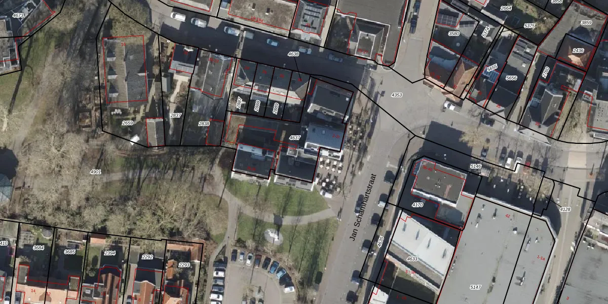 Het perceel waarop Jan Schamhartstraat 2-l staat heeft een oppervlakte van 826 m². Dit is een groot perceel. De perceeloppervlakte wordt geregistreerd door het Kadaster. Gedetailleerde informatie over de maten van dit perceel kunt u vinden in het rapport Kadastrale kaart met maatvoering van Jan Schamhartstraat 2-l.