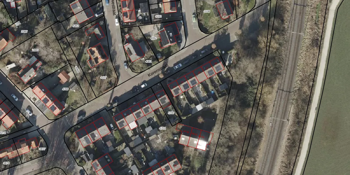 Het perceel waarop Korenstraat 19 staat heeft een oppervlakte van 5067 m². Dit is een zeer groot perceel. De perceeloppervlakte wordt geregistreerd door het Kadaster. Gedetailleerde informatie over de maten van dit perceel kunt u vinden in het rapport Kadastrale kaart met maatvoering van Korenstraat 19.