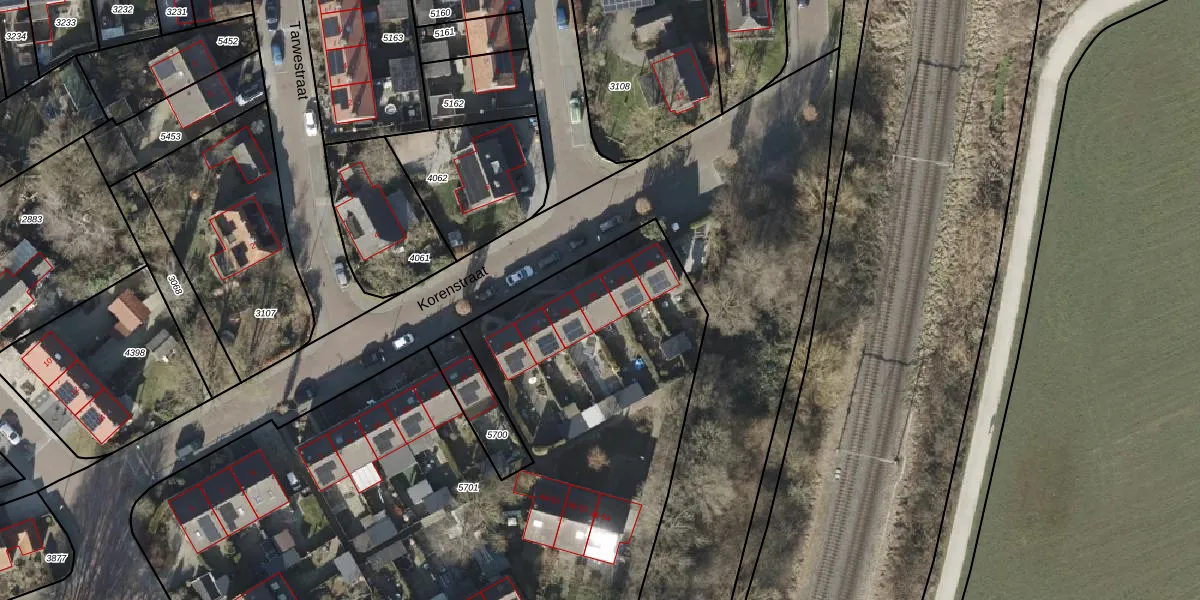 Het perceel waarop Korenstraat 25 staat heeft een oppervlakte van 5067 m². Dit is een zeer groot perceel. De perceeloppervlakte wordt geregistreerd door het Kadaster. Gedetailleerde informatie over de maten van dit perceel kunt u vinden in het rapport Kadastrale kaart met maatvoering van Korenstraat 25.