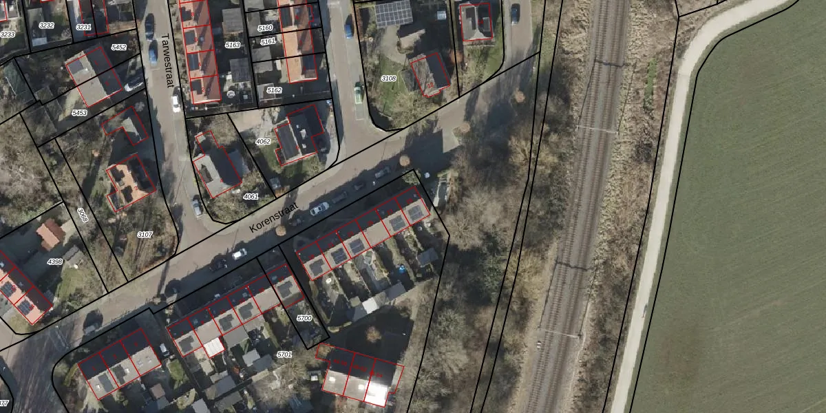 Het perceel waarop Korenstraat 29 staat heeft een oppervlakte van 5067 m². Dit is een zeer groot perceel. De perceeloppervlakte wordt geregistreerd door het Kadaster. Gedetailleerde informatie over de maten van dit perceel kunt u vinden in het rapport Kadastrale kaart met maatvoering van Korenstraat 29.