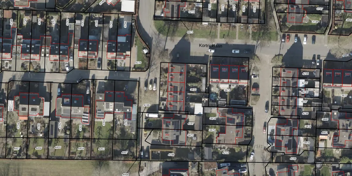 Kortricklaan 210 is gelegen op kadastraal perceel OLS00F3470. Deze kadastrale aanduiding is uniek en wordt gebruikt door het Kadaster om eigendomsrechten en andere zakelijke rechten vast te leggen. Het perceel maakt onderdeel uit van de kadastrale gemeente Olst.