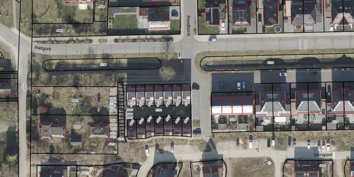 Gebruik de zoekbalk of klik op een perceel voor informatie over de adressen binnen dit perceel.