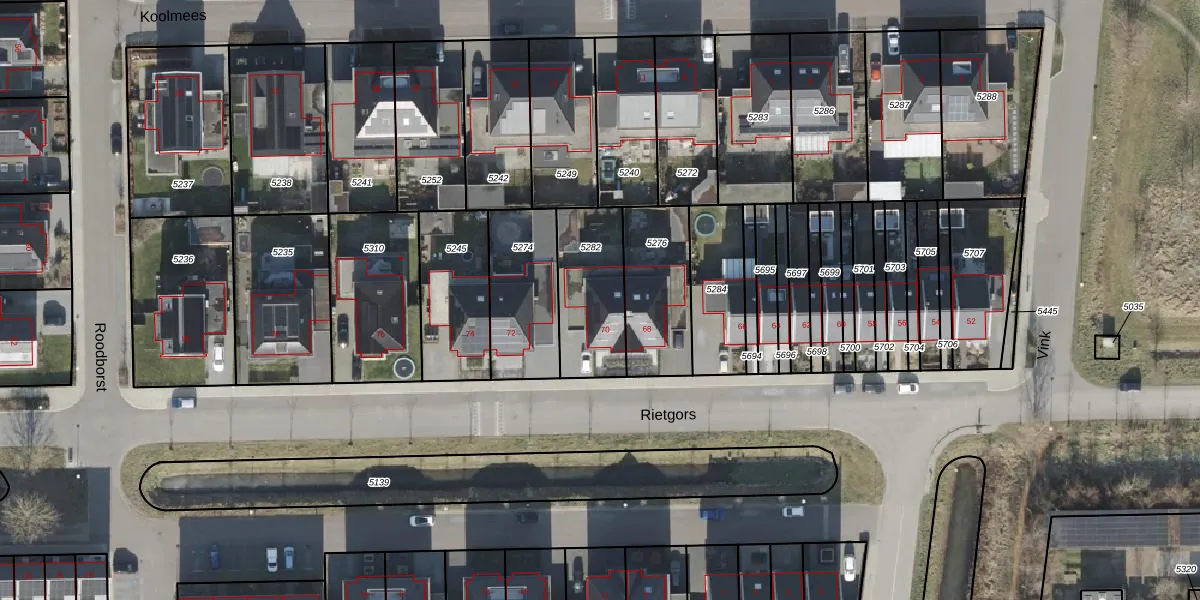 Het perceel waarop Rietgors 70 staat heeft een oppervlakte van 313 m². Dit is een groot perceel. De perceeloppervlakte wordt geregistreerd door het Kadaster. Gedetailleerde informatie over de maten van dit perceel kunt u vinden in het rapport Kadastrale kaart met maatvoering van Rietgors 70.