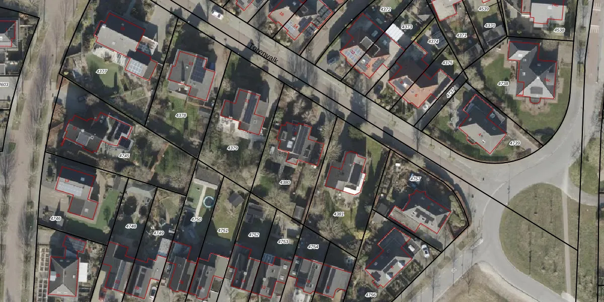 Het perceel waarop Torenvalk 9 staat heeft een oppervlakte van 757 m². Dit is een groot perceel. De perceeloppervlakte wordt geregistreerd door het Kadaster. Gedetailleerde informatie over de maten van dit perceel kunt u vinden in het rapport Kadastrale kaart met maatvoering van Torenvalk 9.