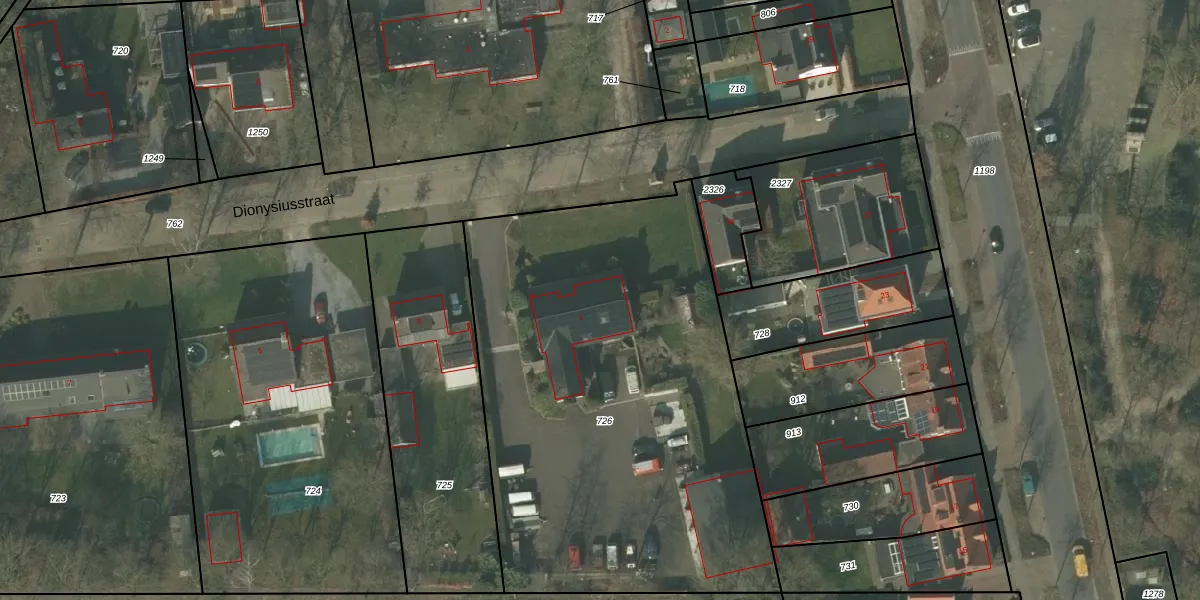 Het perceel waarop Dionysiusstraat 1 staat heeft een oppervlakte van 2748 m². Dit is een zeer groot perceel. De perceeloppervlakte wordt geregistreerd door het Kadaster. Gedetailleerde informatie over de maten van dit perceel kunt u vinden in het rapport Kadastrale kaart met maatvoering van Dionysiusstraat 1.