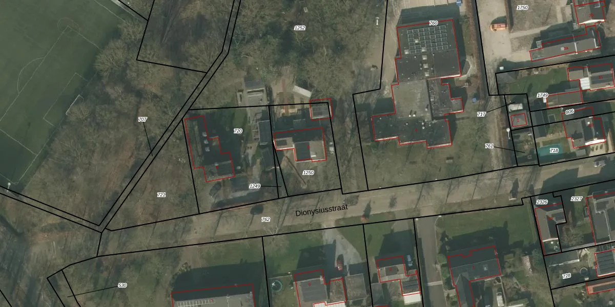 Het perceel waarop Dionysiusstraat 6 staat heeft een oppervlakte van 550 m². Dit is een groot perceel. De perceeloppervlakte wordt geregistreerd door het Kadaster. Gedetailleerde informatie over de maten van dit perceel kunt u vinden in het rapport Kadastrale kaart met maatvoering van Dionysiusstraat 6.