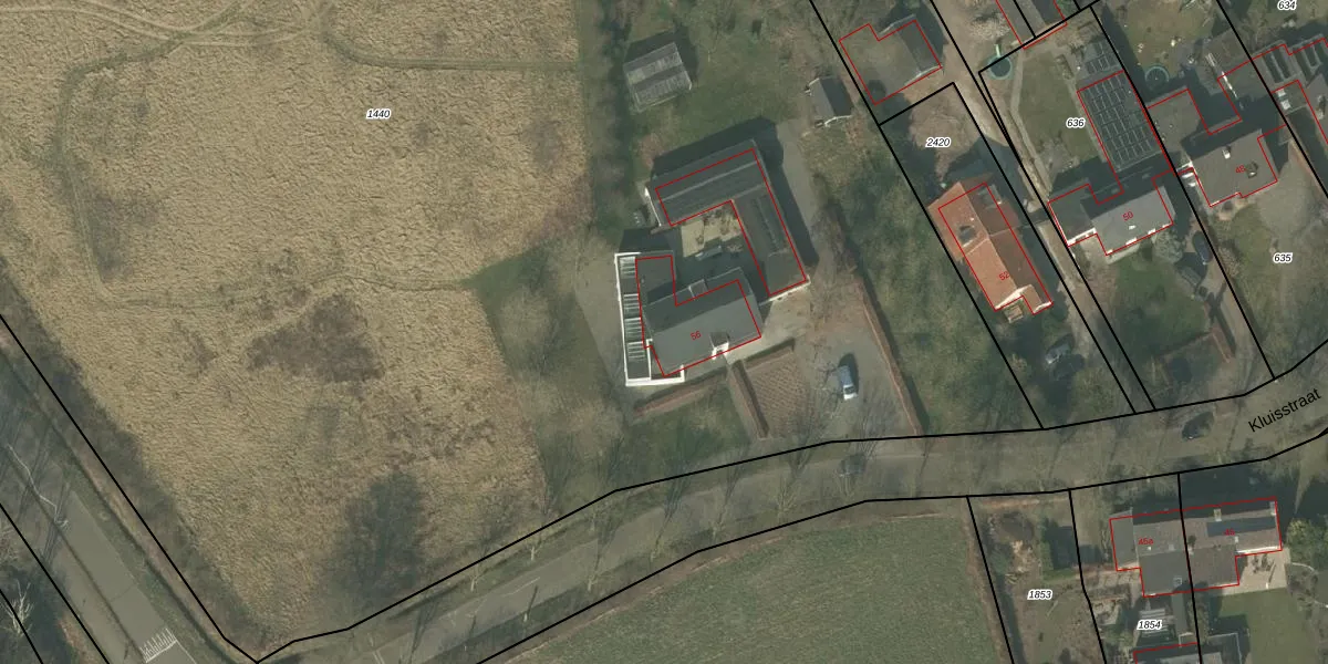 Het perceel waarop Kluisstraat 56 staat heeft een oppervlakte van 1,8 ha. Dit is een zeer groot perceel. De perceeloppervlakte wordt geregistreerd door het Kadaster. Gedetailleerde informatie over de maten van dit perceel kunt u vinden in het rapport Kadastrale kaart met maatvoering van Kluisstraat 56.