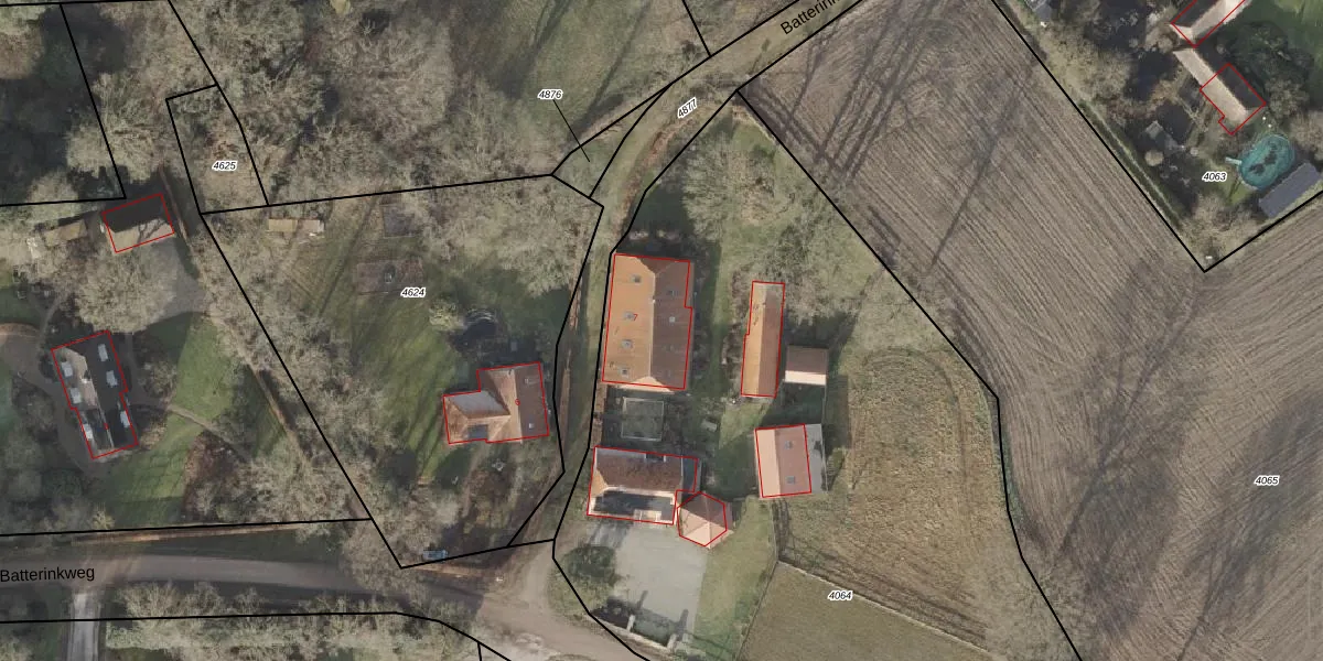 Het perceel waarop Batterinkweg 7 staat heeft een oppervlakte van 5012 m². Dit is een zeer groot perceel. De perceeloppervlakte wordt geregistreerd door het Kadaster. Gedetailleerde informatie over de maten van dit perceel kunt u vinden in het rapport Kadastrale kaart met maatvoering van Batterinkweg 7.