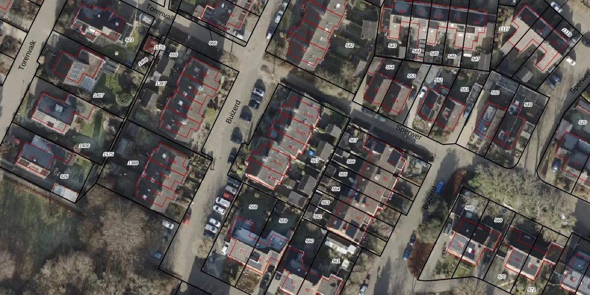 Het perceel waarop Buizerd 25 staat heeft een oppervlakte van 983 m². Dit is een groot perceel. De perceeloppervlakte wordt geregistreerd door het Kadaster. Gedetailleerde informatie over de maten van dit perceel kunt u vinden in het rapport Kadastrale kaart met maatvoering van Buizerd 25.