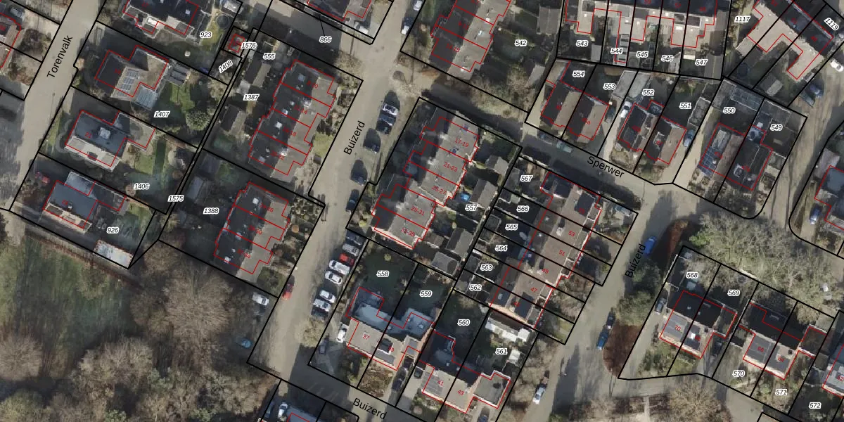 Het perceel waarop Buizerd 29 staat heeft een oppervlakte van 983 m². Dit is een groot perceel. De perceeloppervlakte wordt geregistreerd door het Kadaster. Gedetailleerde informatie over de maten van dit perceel kunt u vinden in het rapport Kadastrale kaart met maatvoering van Buizerd 29.
