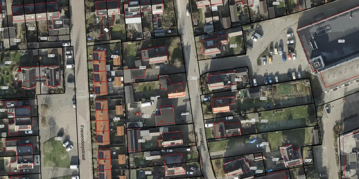 Het perceel waarop Hamsgoren 25 staat heeft een oppervlakte van 970 m². Dit is een groot perceel. De perceeloppervlakte wordt geregistreerd door het Kadaster. Gedetailleerde informatie over de maten van dit perceel kunt u vinden in het rapport Kadastrale kaart met maatvoering van Hamsgoren 25.