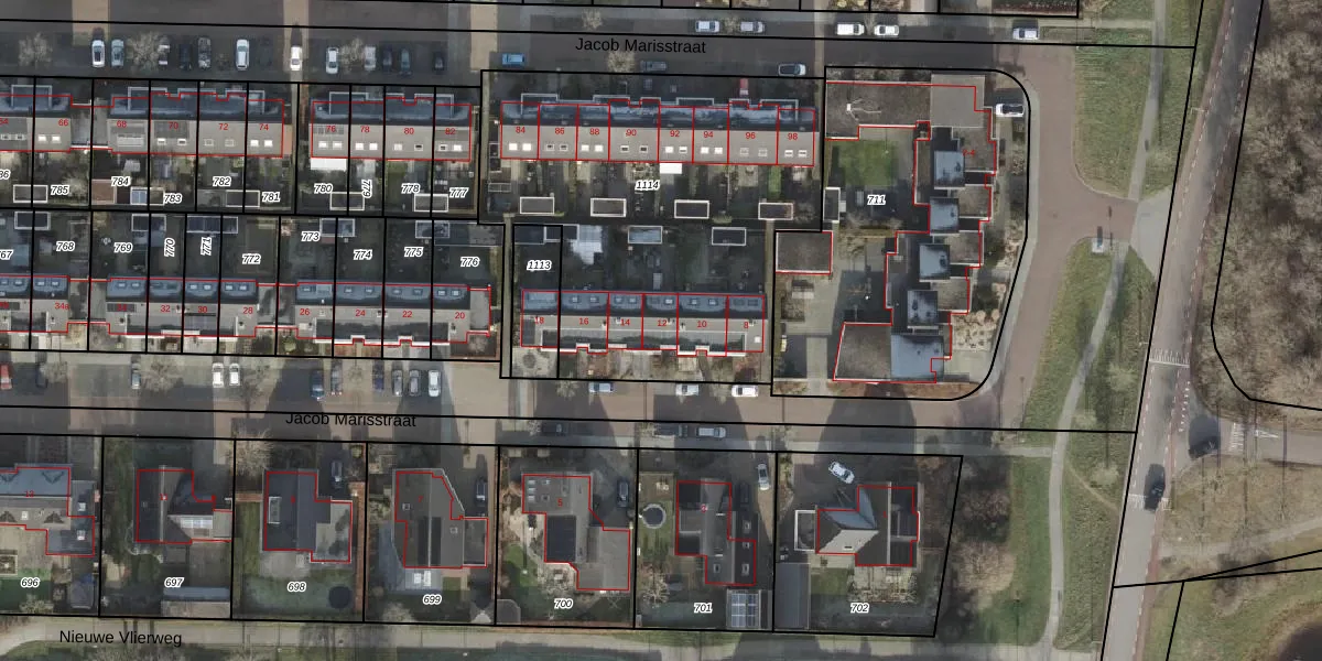 Het perceel waarop Jacob Marisstraat 12 staat heeft een oppervlakte van 1993 m². Dit is een zeer groot perceel. De perceeloppervlakte wordt geregistreerd door het Kadaster. Gedetailleerde informatie over de maten van dit perceel kunt u vinden in het rapport Kadastrale kaart met maatvoering van Jacob Marisstraat 12.