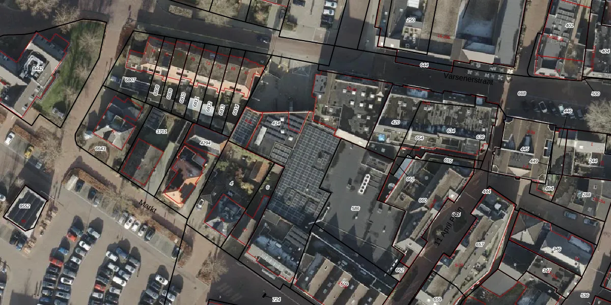 Het perceel waarop Markt 24 staat heeft een oppervlakte van 1915 m². Dit is een zeer groot perceel. De perceeloppervlakte wordt geregistreerd door het Kadaster. Gedetailleerde informatie over de maten van dit perceel kunt u vinden in het rapport Kadastrale kaart met maatvoering van Markt 24.