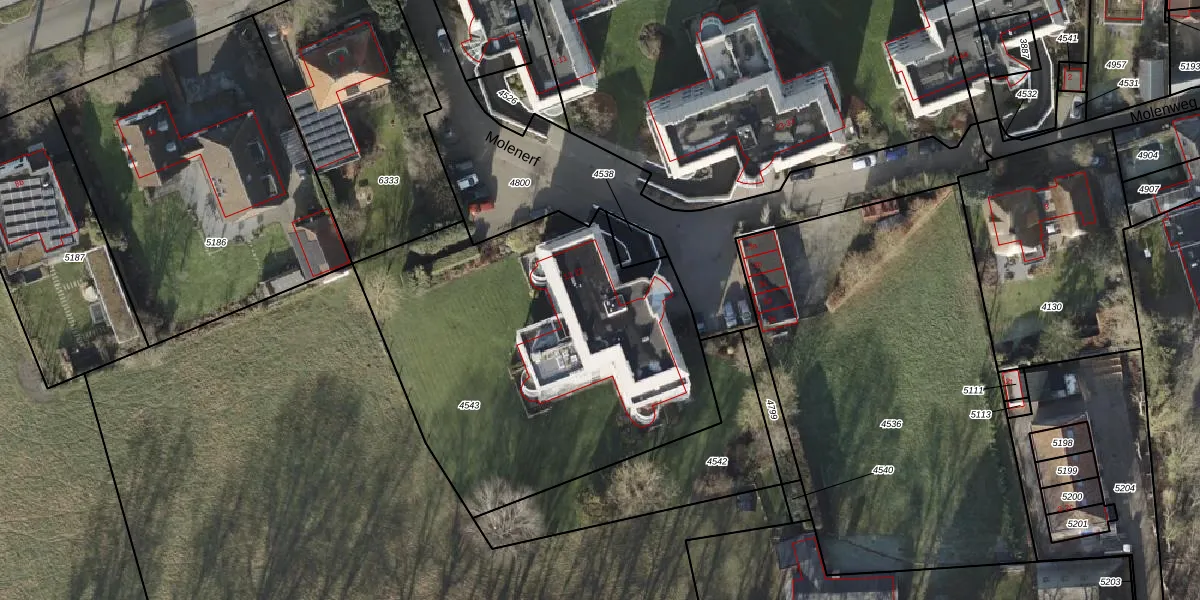 Het perceel waarop Molenerf 12 staat heeft een oppervlakte van 1985 m². Dit is een zeer groot perceel. De perceeloppervlakte wordt geregistreerd door het Kadaster. Gedetailleerde informatie over de maten van dit perceel kunt u vinden in het rapport Kadastrale kaart met maatvoering van Molenerf 12.