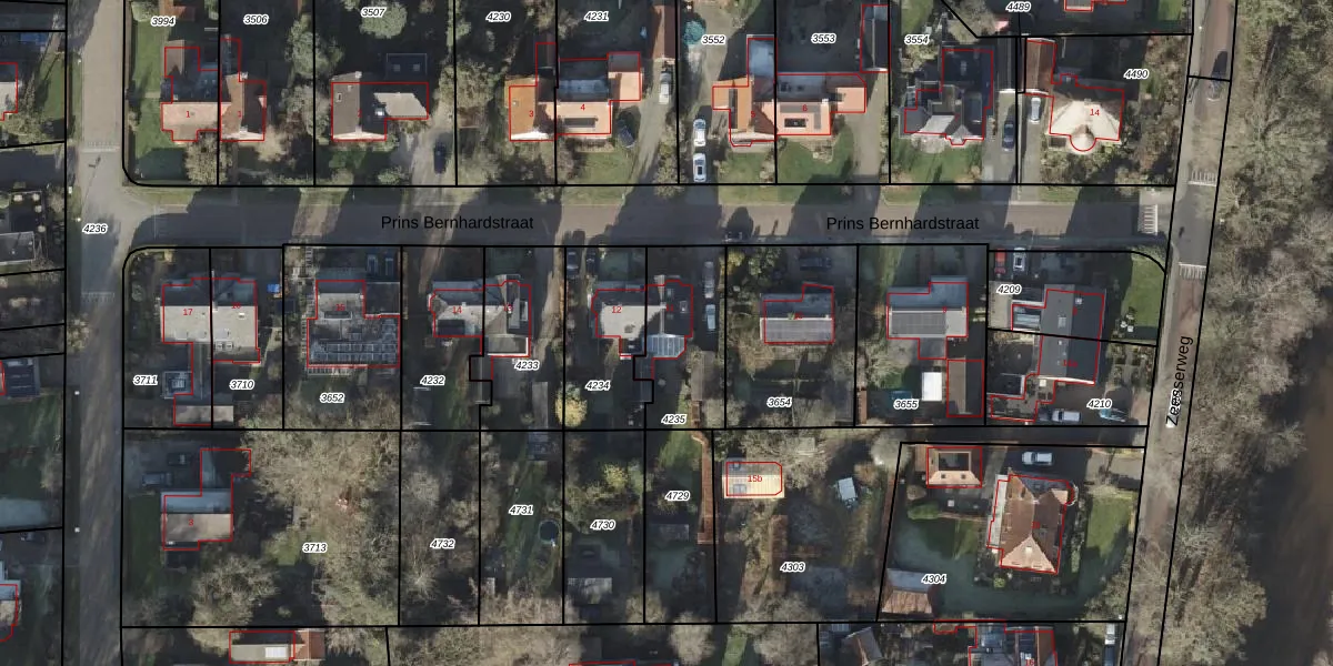 Het perceel waarop Prins Bernhardstraat 11 staat heeft een oppervlakte van 325 m². Dit is een groot perceel. De perceeloppervlakte wordt geregistreerd door het Kadaster. Gedetailleerde informatie over de maten van dit perceel kunt u vinden in het rapport Kadastrale kaart met maatvoering van Prins Bernhardstraat 11.