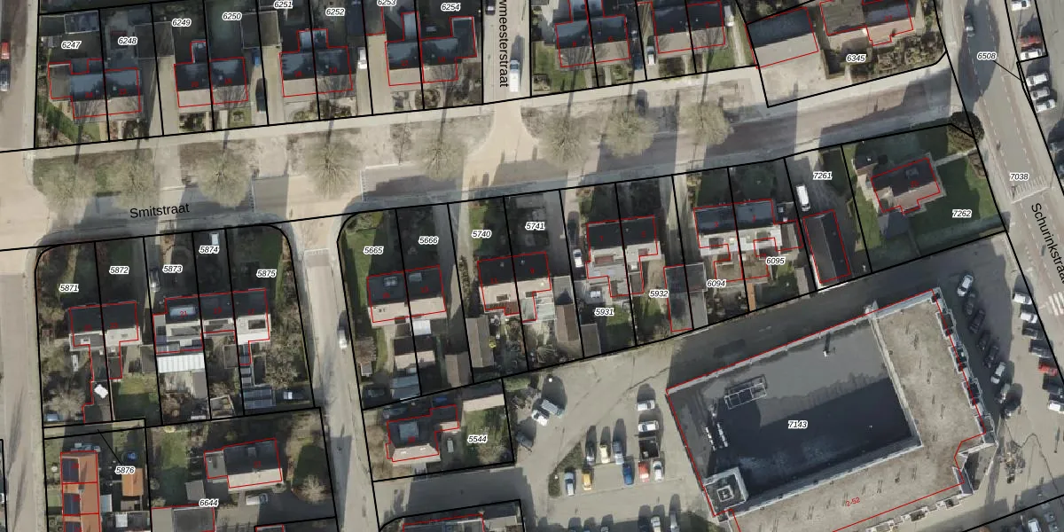Het perceel waarop Smitstraat 9 staat heeft een oppervlakte van 350 m². Dit is een groot perceel. De perceeloppervlakte wordt geregistreerd door het Kadaster. Gedetailleerde informatie over de maten van dit perceel kunt u vinden in het rapport Kadastrale kaart met maatvoering van Smitstraat 9.