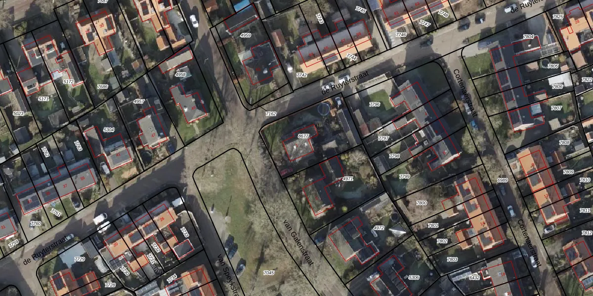 Het perceel waarop van Galenstraat 1 staat heeft een oppervlakte van 571 m². Dit is een groot perceel. De perceeloppervlakte wordt geregistreerd door het Kadaster. Gedetailleerde informatie over de maten van dit perceel kunt u vinden in het rapport Kadastrale kaart met maatvoering van van Galenstraat 1.
