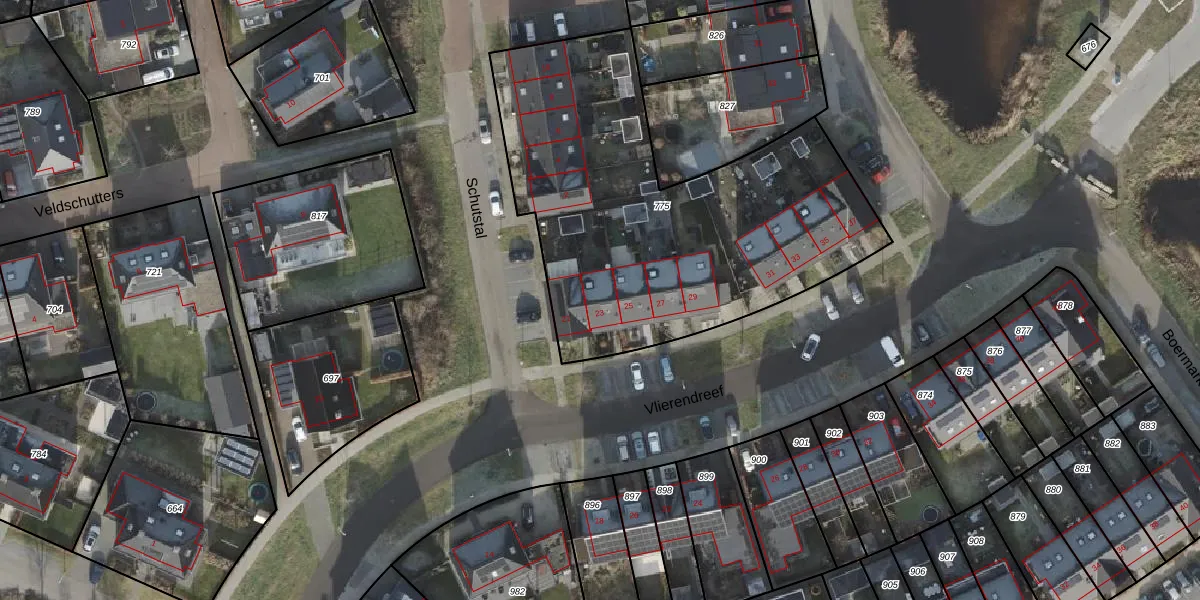 Het perceel waarop Vlierendreef 23 staat heeft een oppervlakte van 2015 m². Dit is een zeer groot perceel. De perceeloppervlakte wordt geregistreerd door het Kadaster. Gedetailleerde informatie over de maten van dit perceel kunt u vinden in het rapport Kadastrale kaart met maatvoering van Vlierendreef 23.