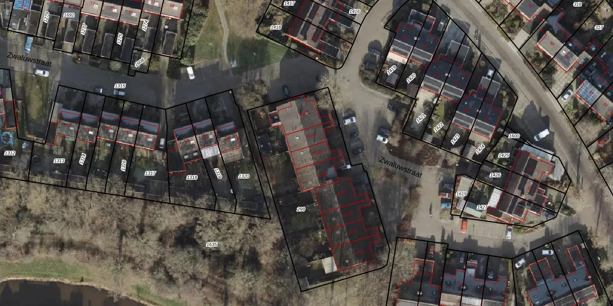 Het perceel waarop Zwaluwstraat 39 staat heeft een oppervlakte van 1793 m². Dit is een zeer groot perceel. De perceeloppervlakte wordt geregistreerd door het Kadaster. Gedetailleerde informatie over de maten van dit perceel kunt u vinden in het rapport Kadastrale kaart met maatvoering van Zwaluwstraat 39.