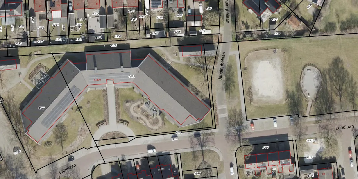 Het perceel waarop Landlaan 2-K-17 staat heeft een oppervlakte van 3703 m². Dit is een zeer groot perceel. De perceeloppervlakte wordt geregistreerd door het Kadaster. Gedetailleerde informatie over de maten van dit perceel kunt u vinden in het rapport Kadastrale kaart met maatvoering van Landlaan 2-K-17.